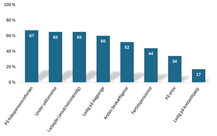 Figuren viser andelen af dem, der har svaret 'Ja' på spørgsmålet, ’Dyrker du normalt sport/motion?’ fordelt på primær beskæftigelse (n=6.778).