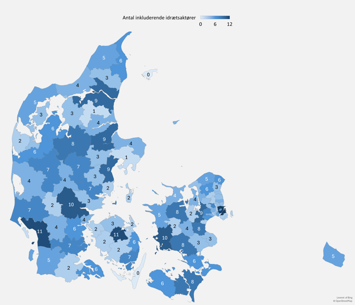 Kortet viser, at der er store forskelle på tværs af kommunerne i forhold til antallet af aktører, der er til stede lokalt. F.eks. finder man 12 forskellige aktører i Københavns Kommune, mens der kun er en enkelt aktør repræsenteret i Syddjurs og Rebild Kommune. I gennemsnit er der 4 til 5 aktører repræsenteret pr. kommune.