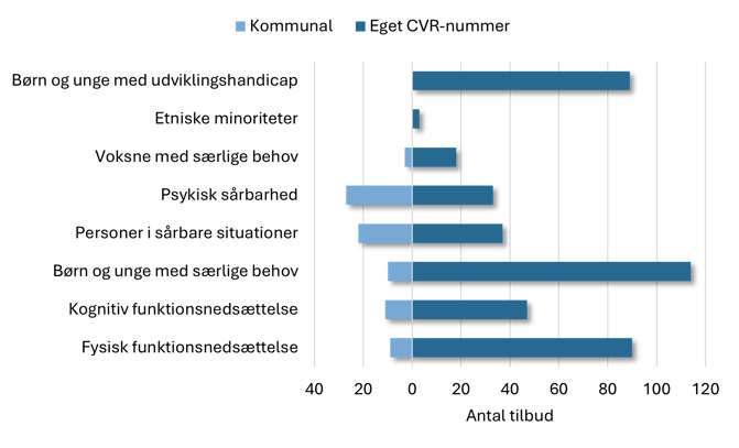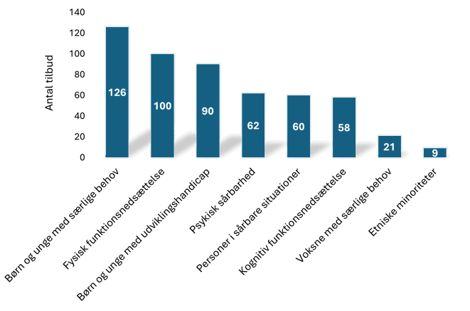 Figuren herunder viser, hvilke målgrupper de forskellige tilbud henvender sig til. Nogle henvender sig til flere forskellige målgrupper, og derfor overstiger antallet i figuren de 328 tilbud.