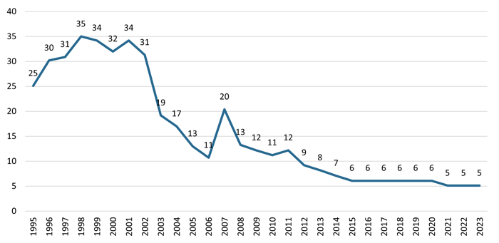 Fra 2002 til 2023 er det samlede kommunale tilskud til daghøjskoler faldet med 50 procent, fra 87 til 43 mio. kroner (i faste 2023-priser).